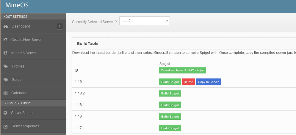 Für Alternative Server müssen die Build-Tools unter Profiles runtergeladen und danach die Seite neu geladen werden. Danach erscheint in der Leiste links unter dem entsprechenden Namen ein Reiter, unter dem die neue Enginge kompiliert werden kann. Dazu erst mit Build Spigot die aktuelle Version kompilieren und anschließend mit Copy to Server auf eueren Server kopieren. Danach entsprechend auf der Serverseite die Version umstellen und den Server neustarten.